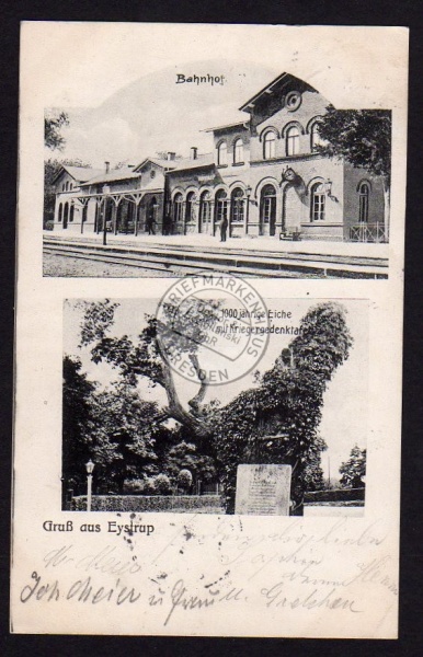 Ansichtskarte Eystrup Bahnhof 1000jährige Eiche mit Kriegerdenkmal Baum, gelaufen 1907