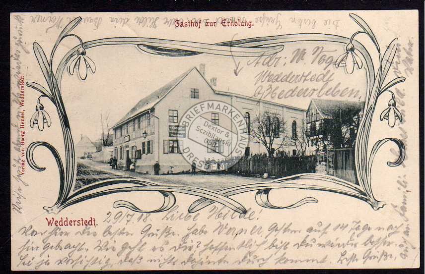 Ansichtskarte Wedderstedt Gasthof zur Erholung 1905 Schneeglöckchen Jugendstil Restaurant Restauration Gasthof Gasthaus Wirtshaus Gaststätte Kneipe, gelaufen 1918