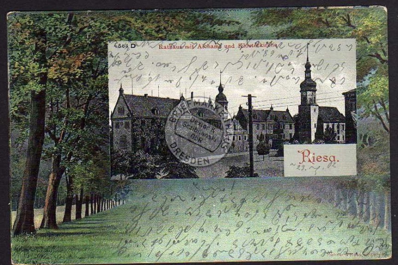 Ansichtskarte Riesa 1902 Rathaus Aichamt Klosterkirche, gelaufen