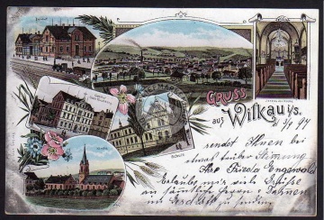 Ansichtskarte Wilkau Sachsen 1897 Bahnhof Gasthof Stadt Kirchberg Schule, gelaufen 1897