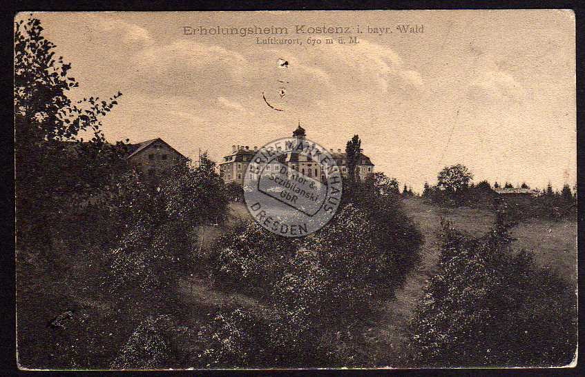 Ansichtskarte Erholungsheim Kostenz Bayr. Wald 1907, gelaufen , Nadelloch
