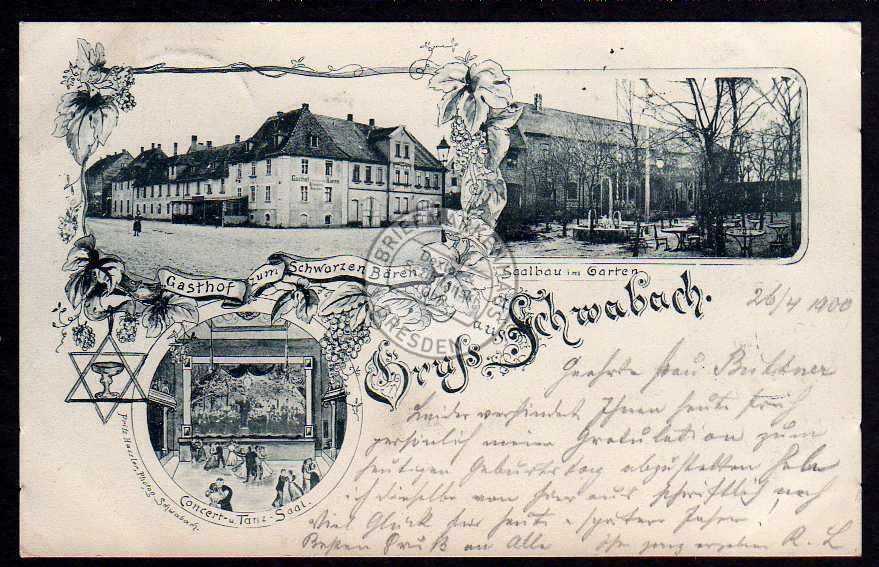 Ansichtskarte Schwabach Gasthof zum schwarzen Bären Saalbau im Garten Restaurant Restauration Gasthof Gasthaus Wirtshaus Gaststätte Kneipe, gelaufen 1900, aus Wikipedia: