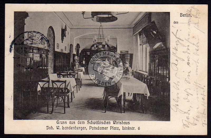 Ansichtskarte Berlin Schwäbisches Wirtshaus Potsdamer Platz Linkstr. 6 ; Restaurant Restauration Gasthof Gasthaus Wirtshaus Gaststätte, gelaufen 1908, aus Wikipedia: