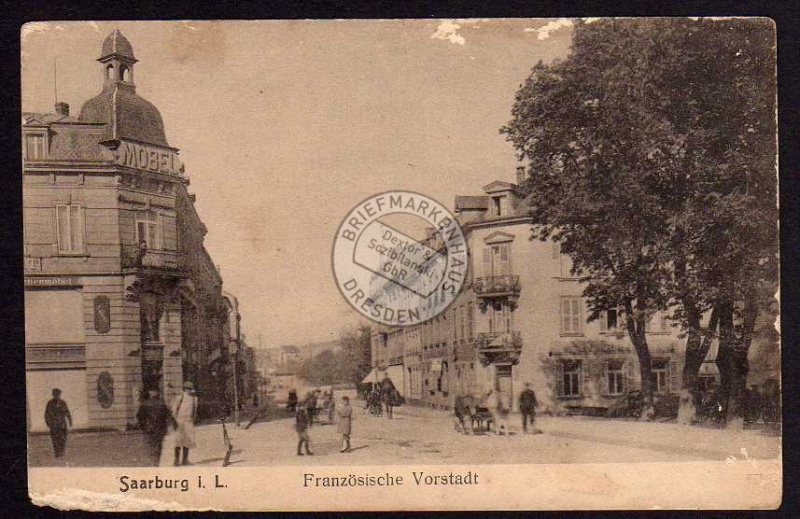 Ansichtskarte Saarburg i.L. Frazösische Vorstadt Möbelhaus, ungelaufen , Ecke unten Papierfraß