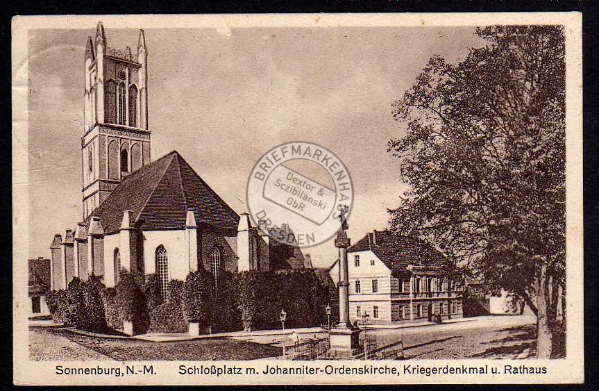 Ansichtskarte Sonnenburg Neumark Schloßplatz ordenskirche Kriegerdenkmal rathaus, gelaufen 1932