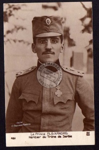 Ansichtskarte Le Prinz Alexandre Karadordevic 1916 Serbie, gelaufen, aus Wikipedia: Alexander I. Karadordevic (in serbischer Namensform Aleksandar I. Karadordevic) auch genannt Aleksandar Ujedinitelj (Der Vereiniger), (* 16. Dezember 1888 in Cetinje, Montenegro; † 9. Oktober 1934 in Marseille, Frankreich) war von 1914 bis 1918 Prinzregent von Serbien und 1921 bis 1934 König des Königreiches der Serben, Kroaten und Slowenen. 1929 löste er die Verfassung auf, proklamierte die Königsdiktatur und benannte das Land in Königreich Jugoslawien um. Im Jahr 1934 kam Alexander durch ein Attentat ums Leben. Er stammte aus dem Haus Karadordevic.