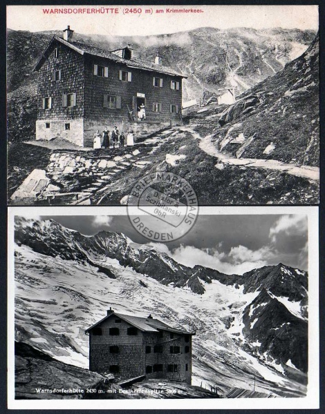 2 Ansichtskarte Warnsdorfer Hütte Sektion Warnsdorf Krimml Alpenvereinshütte, gelaufen 1931 / ungelaufen 1905